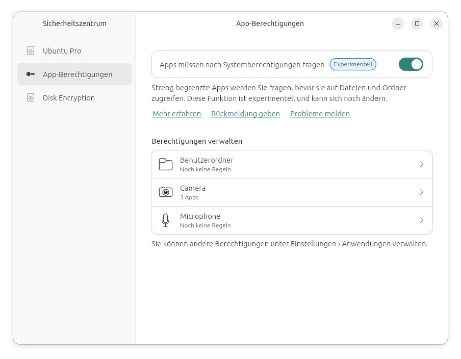 Endlich gibt es eine zentrale Übersicht, welche Apps worauf zugreifen dürfen. Die Snap-Permissions-Prompts sind standardmässig aktiv: Will ein Snap-Paket auf Kamera, Mikrofon, Standort oder private Dokumente zugreifen, poppt ein verständliches Fenster auf. Per Klick wird entschieden: erlauben oder verweigern. Das kennen Smartphone-Besitzerinnen seit Jahren, unter Linux ist es eine willkommene Neuerung.